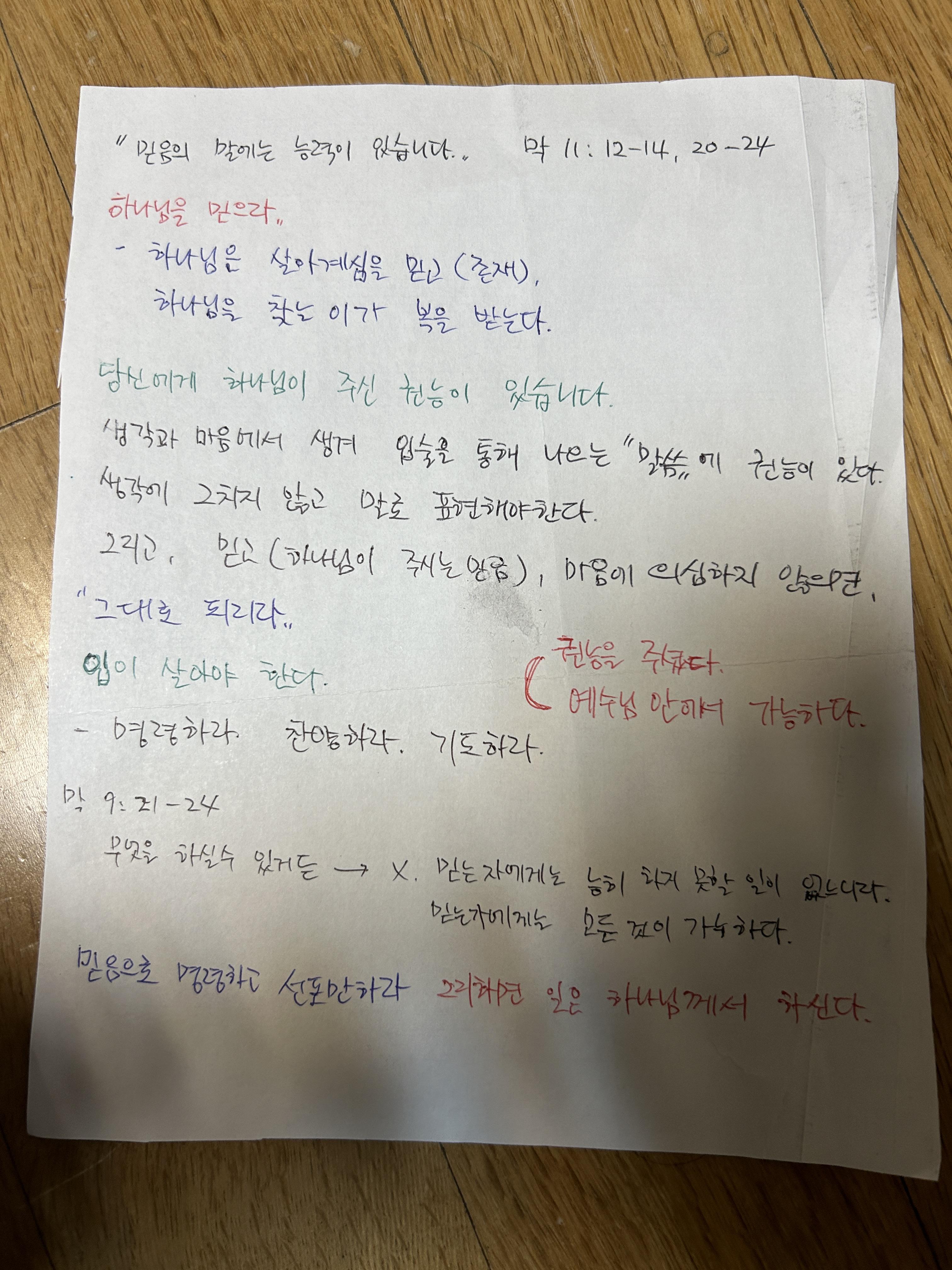 마가복음 11:12-14, 20-24 12. 이튿날 그들이 베다니에서 나왔을 때에 예수께서 시장하신지라 13. 멀리서 잎사귀 있는 한 무화과나무를 보시고 혹 그나무에 무엇이 있을까 하여 가셨더니 가서 보신즉 잎사귀 외에 아무 것도 없더라 이는 무화과의 때가 아님이라 14. 예수께서 나무에게 말씀하여 이르시되 이제부터 영원토록 사람이 네게서 열매를 따 먹지 못하리라 하시니 제자들이 이를 듣더라 20. 그들이 아침에 지나갈 때에 무화과나무가 뿌리째 마른 것을 보고 21. 베드로가 생각이 나서 여짜오되 랍비여 보소서 저주하신 무화과나무가 말랐나이다 22. 예수께서 그들에게 대답하여 이르시되 하나님을 믿으라 23. 내가 진실로 너희에게 이르노니 누구든지 이 산더라 들리어 바다에 던져지라 하며 그 말하는 것이 이..